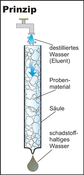 Die mit Probenmaterial gefüllte Säule wird kontinuierlich mit Wasser durchströmt. Das Wasser wird aufgefangen und anschliessend analysiert.